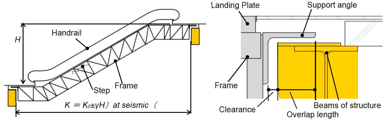 Figure 1 shows the side view of a typical escalator and an enlarged view of the support angle. The span (K) fluctuates from its initial dimension (K0) by story drift. The clearance (the distance between the support angle and the structural beam’s vertical plane) and overlap length (The overarching length of the support angle over the structural beam in the horizontal plane) of the support angle are changed during an earthquake.