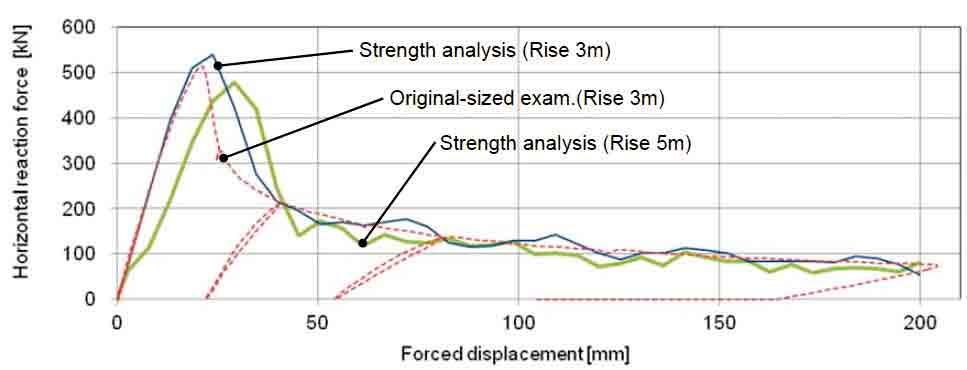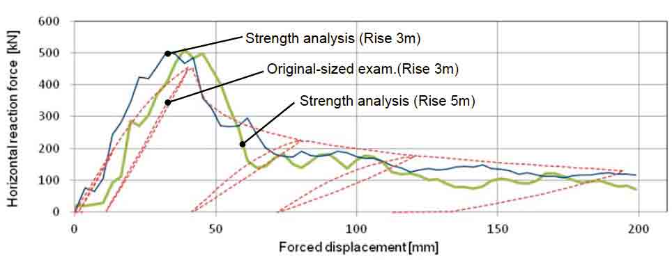 When comparing the strength-analysis results of the 3- and 5-m rises, effect of the change in rise was not great. Overall, for both the simulation and the actual-size test, the horizontal reaction force still existed, even up to the point where the forced displacement was 200 mm.