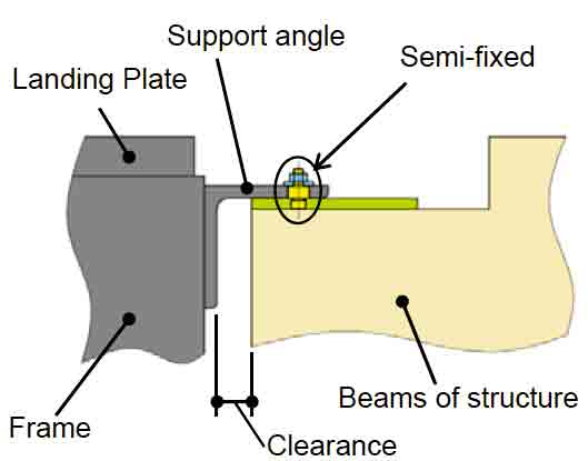 Hitachi has considered both the overlap length and clearance in response to the change in story drift in the new seismic criteria. In the case of a one-side-fixed structure, where one side is fixed, while the other side is not, it is only possible to provide sufficient clearance at the side that is not fixed. Furthermore, if the clearance becomes large at one side, the moment arm of the support angle increases, causing the stress condition to become severe. On the other hand, necessary clearances can be allocated at both ends of an unfixed structure. In this case, the clearance at both ends is shortened, thereby causing the stress that occurs at the support angle to be reduced. Therefore, the unfixed structure at both ends was adopted for new escalators. The lateral motion of the escalator is constrained by utilizing parallel restrictors (lateral direction safety catch).