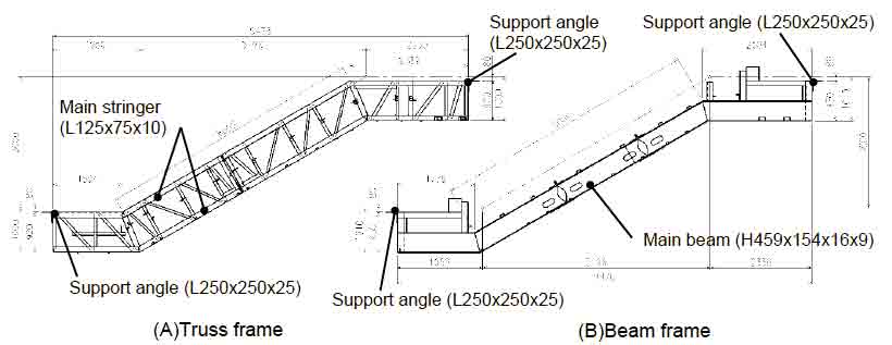 Two types of frames were considered. The first is a truss frame (pattern A), while the second is a frame where H-rolled steel materials are extruded to form a beam (pattern B). For comparison with the actual-size test, the rise of the escalator is set at 3 m (same as the actual-size test). The outer dimensions of each frame are shown in Figure 3. In addition, another simulation was conducted on an escalator with a frame of 5-m rise to check the influence of the 200-mm forced displacement on an escalator with a higher rise.