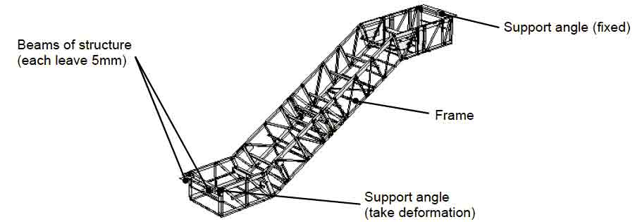 The escalator was modeled using a frame and support angle necessary for withstanding its weight. The analysis model was created using primary element shells, which contain integral calculus elements, and a concentrated point mass was given to each element. The mass of every passenger, step, moving handrail, balustrade part and the internal apparatus was input as a vertical point load. The loads were applied onto the stringer at the upper portion of the frame structure.