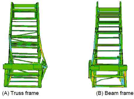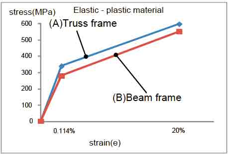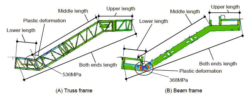 The stress around the lower flexural point was obtained through the analysis. These values were below the fracture stress of the material. For truss frame A, the stress value obtained was 536 MPa (fracture stress safety factor of 1.11). The stress value obtained for beam structure frame B was 368 MPa (fracture stress safety factor of 1.50).