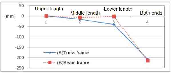 Comparing the deformation from the front elevation, truss frame A experienced a larger change than beam structure frame B. This is likely due to the difference in rigidity of the respective frames’ constituent members.