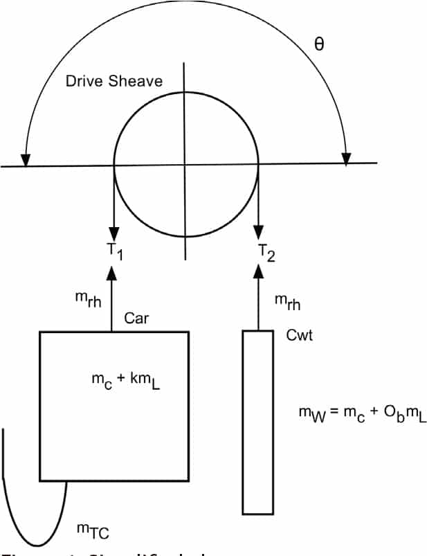 A simplified 1:1 roped elevator system is shown in Figure 1. The Notations used are defined toward the end of this article. SI dimensional units are shown.