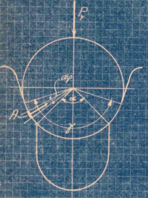 It is clear from Hymans’ early papers that the effective coefficient of friction that comes into play in applying the Euler Eytelwein equation at the rope-groove interface had to be variable, depending on the geometry of contact between the rope and groove surfaces.[13-19] This hypothesis set the stage for his mathematical analysis of the forces generated at the interface of the rope and groove to result in varying degrees of available traction, depending on the shape of the groove. In late summer/early fall 1920, Hymans undertook his preliminary mathematical analysis of the rope tractive effort at the rope-to-groove contact region.