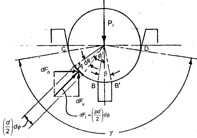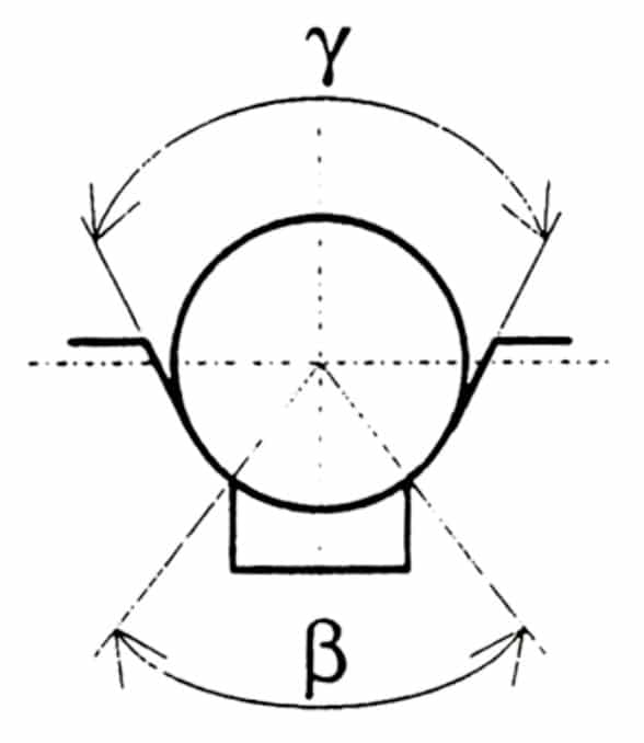 Starting with the derivation for the radial force per unit length of ropes,[13] Hymans mathematized the distribution of the groove pressure[14] resulting from the hoist rope bearing down against the groove contact surface (See Figures 11 and 12). From this, he was able to derive the  magnitude of the groove pressures.[14] In the book [20], this groove illustration is given as Figure 35,P.57. In the original manuscripts, the angle subtending the undercut was given as a. In later years, a was re-designated as the available traction, and the undercut angle was assigned the symbol β.