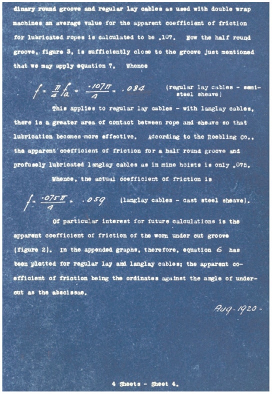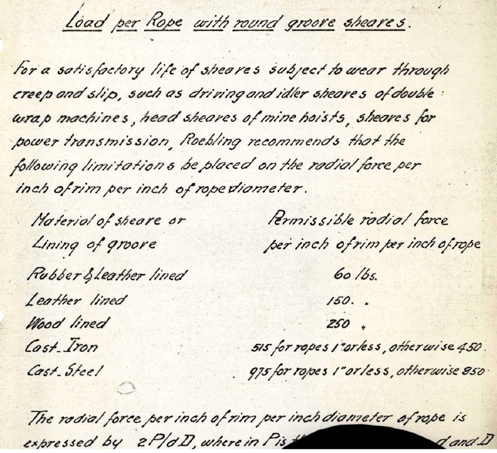 Hymans established allowable load per rope based on his theoretical analyses coupled with test data. A sample is seen in Figure 18. His lettering style rivaled that of a typewriter! Based on this, the Hymans’ reformulation of the Euler Eytelwein equation applicable to traction elevator drives is given as:
