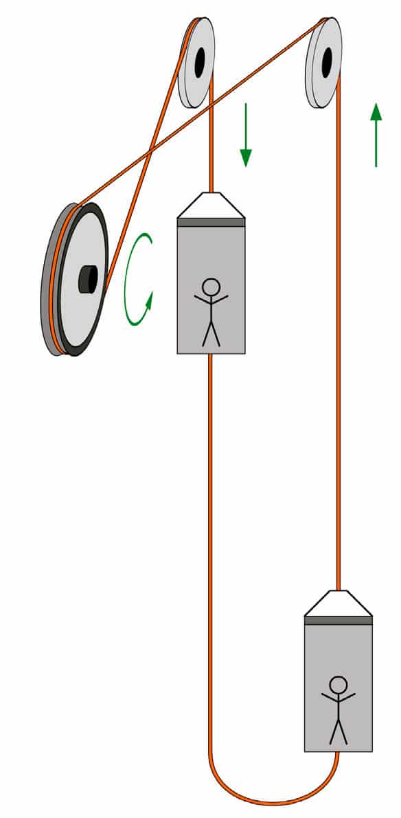 “The weight of the elevator on one end and the counterweight on the other presses the cables down on the grooves of the sheave. When the large electric motor turns the sheave, it moves the cables with almost no slippage.” [12]