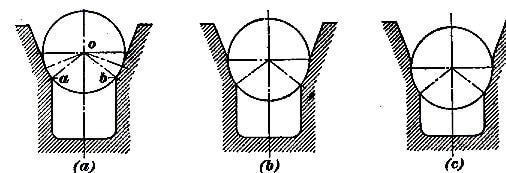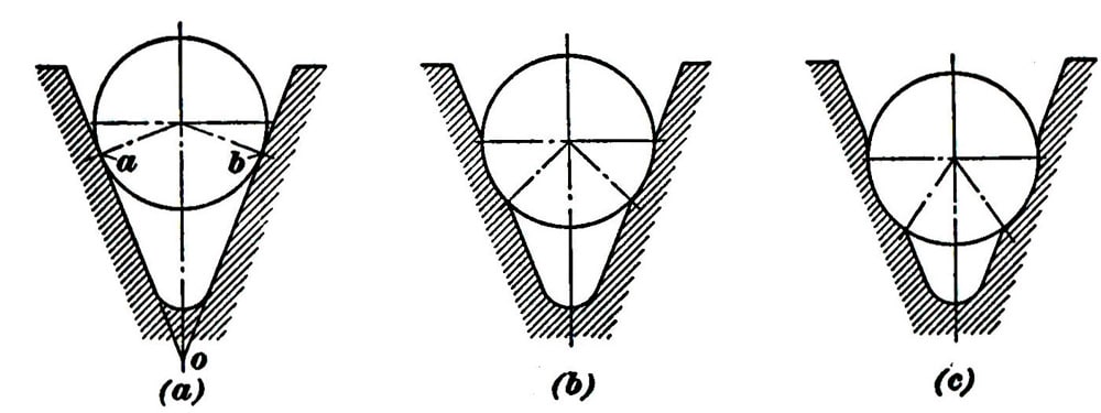 Early geared traction elevator machine drive sheaves starting in 1911 utilized V-grooves because of their high tractive capability attributed to the pinching of the rope within the groove. When the groove is new, the rope contacts the V-profile at two points at the respective sides of the V-groove (Figure 4 (a)) at points a and b, resulting in very high rope-to-groove pressures and high tractive effort. With the passage of time, the rope wears a rounded seat on both sides of the V-groove, (Figure 4(b)), thereby diminishing the pinching effect of the V-profile, inducing lower rope-to-groove pressures, which, in turn, results in a lessening of the available traction. As time goes on, the condition continues to worsen (Figure 4(c)). Once this occurs, the car continues sliding past the floor during slowdown, and accelerated wear between the rope and groove ensues. The only remedial action is to recut the sheave grooves to their original profile.[10 & 11]