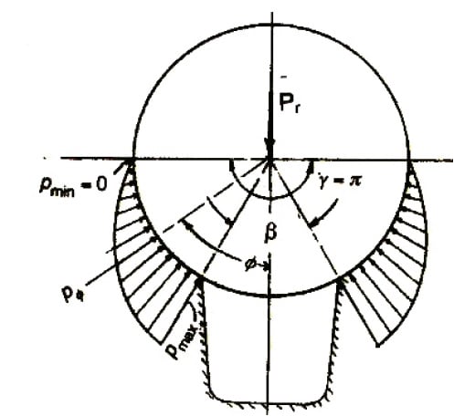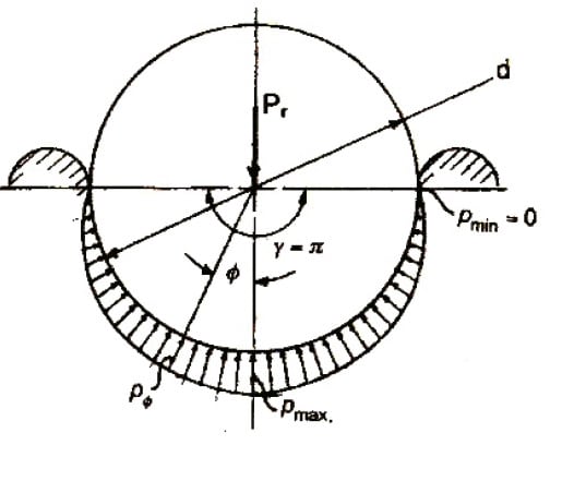 Equation (8) uses the variables shown in Figures 8, 9 and 15. The radial force, Pr, causes a pressure distribution over the lower boundary of the rope profile, thereby maintaining it in a state of vertical equilibrium. It is physically distributed over the regions of rope-to-groove contact. Such pressure distributions are shown graphically to a relative scale in Figures 8 and 9 for the groove configurations of round-seat and undercut grooves, respectively. For purposes of comparison, two grooves are shown.[1] In Figure 8, a round-seat groove is shown where the pressure decreases from its maximum, pmax , near the bottom of the rope profile contact with the groove to its minimum, pmin = 0, at the top of the groove. The mathematical model is for a slightly worn groove, such that the region of contact of the rope within the groove is shown for the case, where γ = 180° = π.