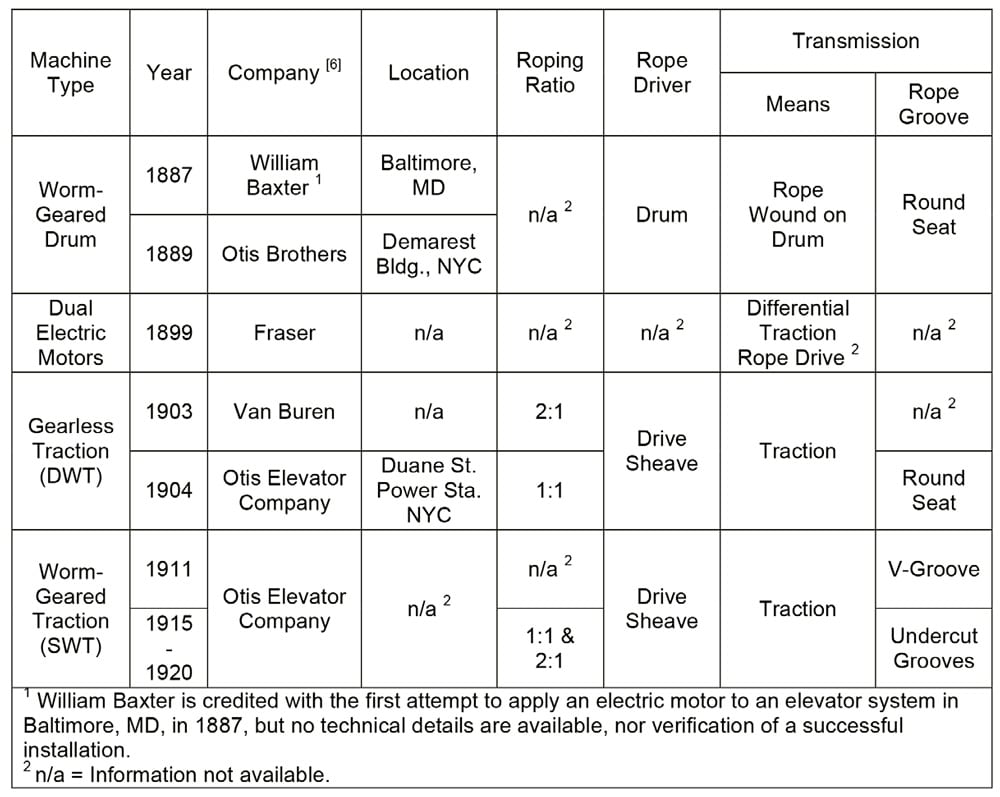 The electric gearless traction machine supplanted the high-speed multiply-reeved roped hydraulic elevator system in the early 1900s (Table 1). In the evolution of successful early electric traction elevator machines and rope drive methods, first came the worm-geared machine with a drum drive for the hoist ropes. Next came the gearless machine with traction drive, followed by the worm-geared machine with the drive sheave inserted in place of the drum, resulting in the traction drive. While the elevator industry at large used the V-groove on worm-geared traction-machine drive sheaves, Otis drive-sheave grooves moved to the undercut grooves (U/C) type based on Hymans’ analysis and design of the family of U/C grooves.