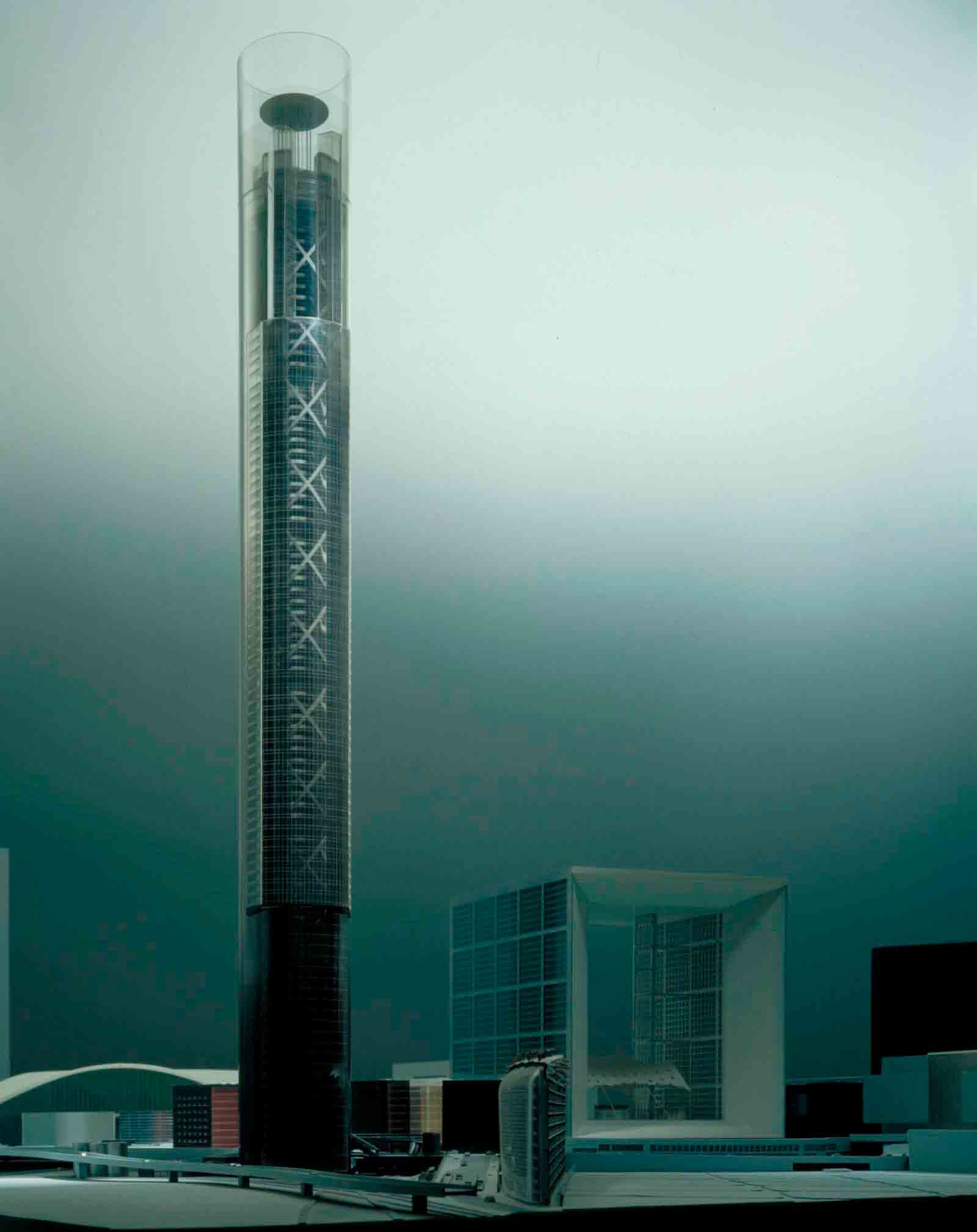 - Figure 1: 100-story office tower Tour Sans Fins, planned for the La Défense business district of Paris: design architect: Ateliers Jean Nouvel. Status: design complete; elevator/lift work awarded to Schindler; not built