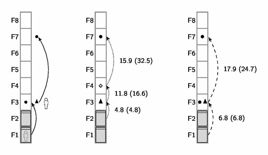 The single-level model has a disadvantage in that it may produce inefficient elevator routes when minimizing passenger waiting times. An example of such a situation is shown in Figure 1 (left), where a passenger inside the lower deck is traveling toward F3, and another is waiting for transportation from F3 to F7. The numbers beside the arcs show the combined stop and flight times between the corresponding start and end floors of the flight, as well as the elevator arrival time on the end floor (in parentheses). In this example, the problem is to decide whether the lower or upper deck picks up the waiting passenger on F3. Clearly, the upper-deck solution shown in the middle minimizes waiting times, since it takes only 4.8 s for the upper deck to reach F3, compared to the 6.8 s it takes the lower deck. However, the upper-deck solution contains a stop, during which the lower deck