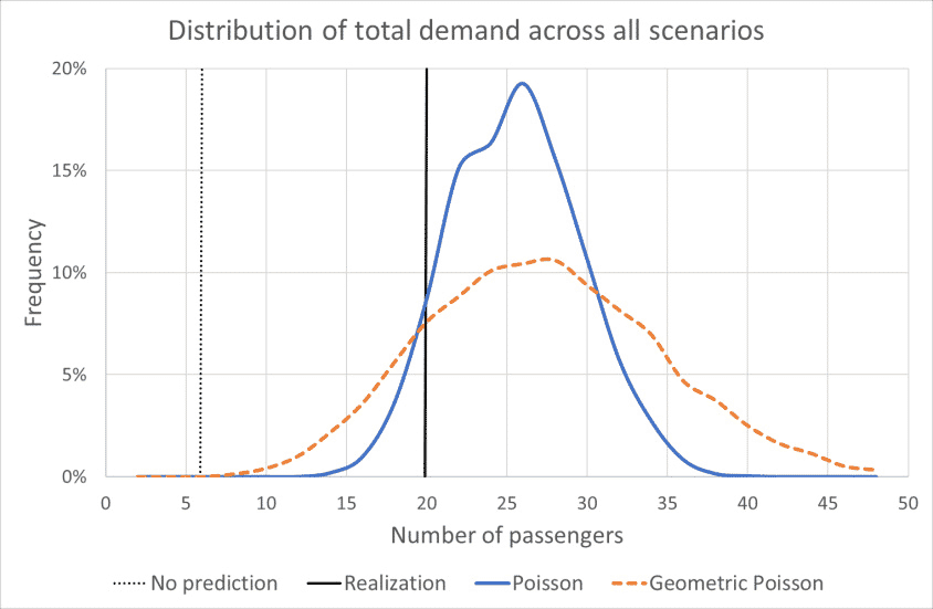 Clearly, the solution to the snapshot EDP has a risk of becoming suboptimal, since the realized passenger demand is much higher than assumed without predictions. The estimation with the geometric Poisson process results in wider distributions than the Poisson estimates. This guarantees the robustness of the solution. Furthermore, the realized values remain within the range only when assuming the geometric Poisson process. This indicates a batch arrival process should be used in passenger prediction.