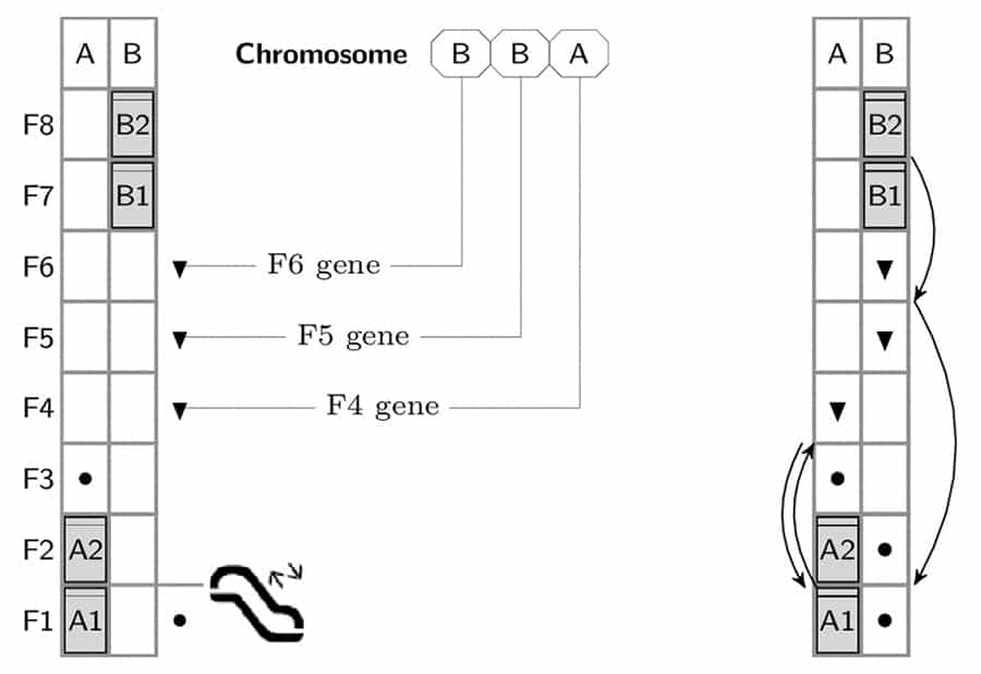 The bilevel DD-EDP problem only assigns an elevator to a passenger call on the upper level. The genetic algorithm is slightly modified to solve the bilevel model: a gene value represents an elevator index. Thus, a chromosome corresponds to a solution to the upper-level problem. Figure 3 describes the principle through an example, where deck A1 has a passenger traveling to F3, and three passengers on floors F4, F5 and F6 are waiting to be picked up and transported to the main lobby. The task is to assign an elevator and a deck to these three passenger calls. The outgoing passengers can be served by both decks and transported to the lower or the upper lobby level according to the optimal solution. From the upper lobby, the passengers can use the escalator to travel to the ground-floor exit. The chromosome shown on the left side of the figure assigns the call on F4 to elevator A, and the calls on F5 and F6 to elevator B. The optimal deck assignments and elevator routes for this upper-level assignment are shown on the right side of the figure. Thus, the optimal solution takes advantage of coincident calls on F3 and F4 (simultaneous delivery and pickup), as well as on F5 and F6 (two simultaneous pickups).