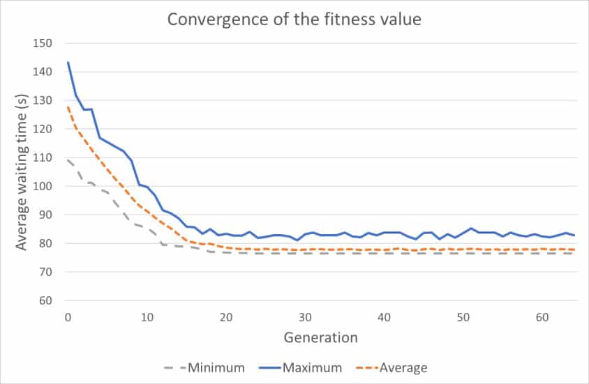 As an example, consider a large-scale instance in which 32 passenger calls are waiting for pickup. A group of five double-deck elevators serves all floors. One call is newly registered, while 31 are waiting for pickup. Thus, when applying the bilevel model to this problem, the number of feasible solutions equals five for the IA and DDA but 532 > 1022 for the DEA. Even if the evaluation of one solution took 1 µs, the evaluation of all feasible solutions would take 108 years in the case of the DEA. The genetic algorithm, however, evaluates only about 3,000 candidate solutions before converging to the likely optimum in less than 100 ms, which is fast enough for real-time optimization.[18] The fast convergence of the genetic algorithm is demonstrated in Figure 4, which shows the evolution of population fitness throughout the generations. In the initial population, the minimum (best), maximum and average fitness values are all high. However, they drop sharply within approximately 15 generations to such a level that large improvements are not found anymore. The best solution is found during the 24th generation, while the algorithm continues to search for better solutions until the 64th generation.