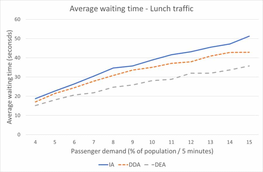 However, the DEA clearly provides the best service quality. The significance of the above results is clear if they are contrasted with elevator planning. Typically, passenger demand of 11% or 12% of the population per 5 min is assumed as the required handling capacity for lunch traffic. For such a high demand, passenger waiting time is usually the determining design parameter for the DD DCS. Typically, an average of less than 40 s is required. As shown in Figure 5, the average waiting time with the IA is slightly greater than 40 s with 11% and 12% demand.