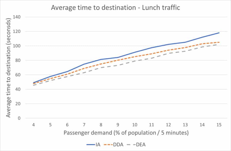 The improvements by delayed assignment policies in times to destinations combine the observations about waiting and transit times. With the DDA, average transit times are up to 8 s, or 7-8%, shorter than with the IA, which is the result of reductions in both waiting and transit times. The improvement provided by the DEA in average time to destination can be attributed to the improvement in average waiting time. The reduction is up to 15 s but varies between 10% and 15% for different passenger demands. As a result, the DDA and the DEA are rather close to each other (within 5 s), with respect to average time to destination.