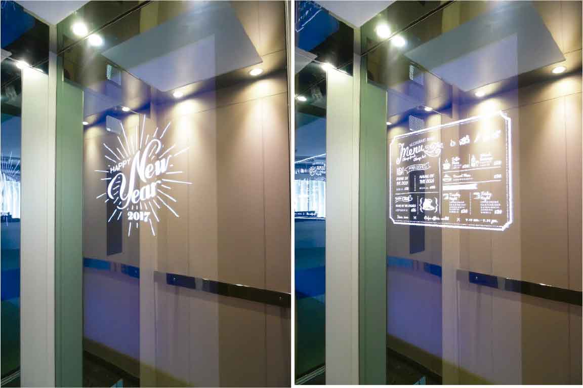 In traditional lift systems, cars are passive; i.e., they lack means suitable for communication, the ability to provide the user with audio and video signals, etc. If present, the auxiliary communication means (traditional TV screen, touchpad, etc.) affects the appearance and design of the space inside the car. Such devices have a limited quality in terms of design opportunities, video dimensions and brightness, and custom solutions. Moreover, TV screens and touchpads are exposed to various risks (e.g., vandalism and robbery).