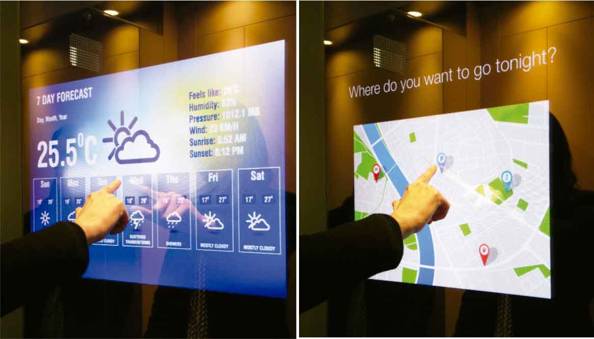 Gateway is an Internet of Things (IoT) technology applied to glass mirrors in lift cars. It transforms common lift-car mirrors into interactive touchscreen displays managed remotely via the internet. Unlike traditional cars’ video screens, Gateway has many different purposes: