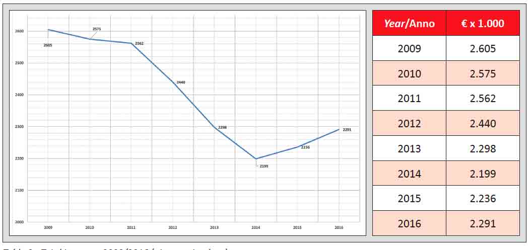 In the 2009/2015 period, the internal market, representing products sold only in Italy, constantly decreased, going from EUR2.090 billion (US$2.43 billion) in 2009 to EUR1.608 billion (US$1.87 billion) in 2015. The decrease curve has become steepest since 2011.