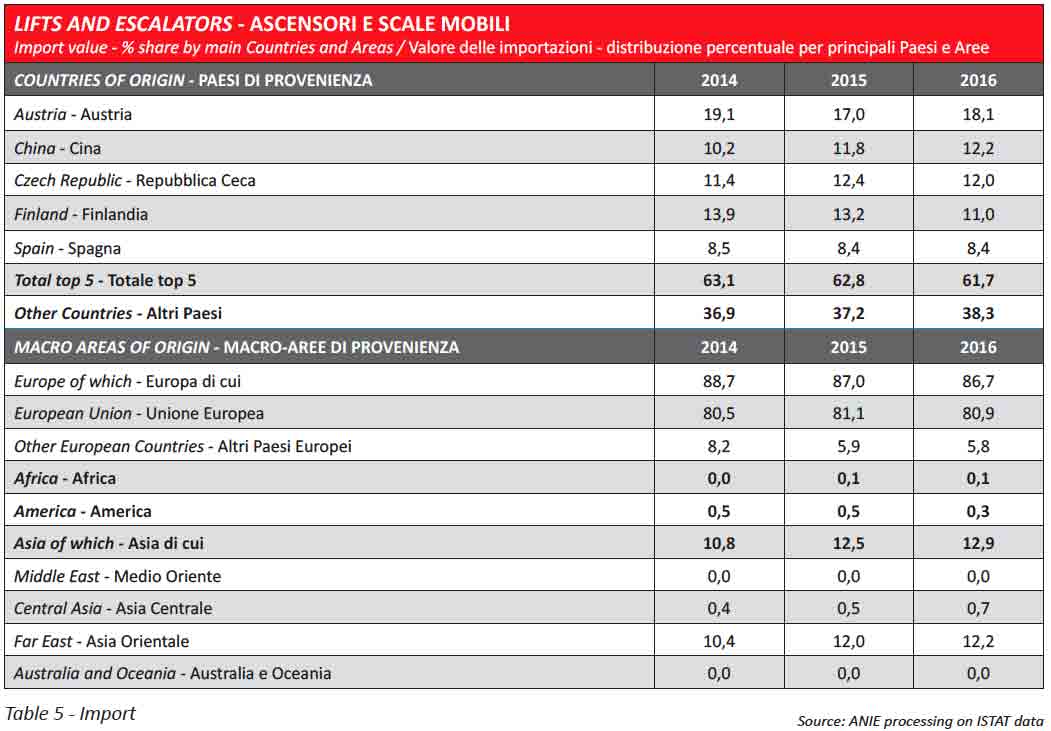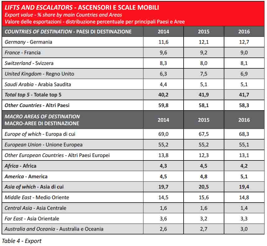 In 2016, Italian lift exports kept growing (+2.8% versus +3.1% in 2015/2014), reaching turnover of EUR957 million (US$111.4 million). They were at EUR931 million (US$108.3 million) in 2015 and EUR902 million (US$105 million) in 2014. This mostly derives from the stability of the core European markets, which represent more than 68% of total exports (Table 4). However, demand from non-European markets showed a deeper weakness.