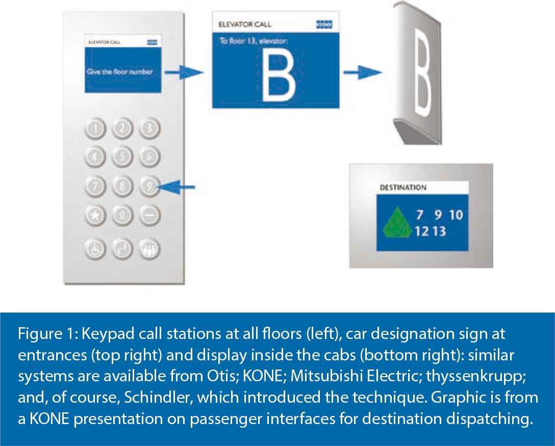 In knowing passengers’ destinations at the main lobby, cars can be assigned to groups of people by some commonality in their destinations, such as by floor zones or sectors, to reduce elevator stops and travel and, therefore, car round-trip time back to the main lobby. Note that techniques such as Otis Channeling® (invented by Joseph Bittar and Kandasamy Thangavelu) using dynamic sectoring or zoning also boosted up-peak performance at the main lobby. Individual floor buttons in a lobby actually date to the 1960s with the work of Leo Weiser Port in Australia. However, Schindler Miconic 10® was the first successful destination-dispatching system that also organized traffic queues at the main lobby, while boosting up-peak performance. There have been many patents since using floor destinations entered in an elevator lobby, even including a few Otis patents by your author (Frederick Barker) with coinventors such as Bittar and Powell.