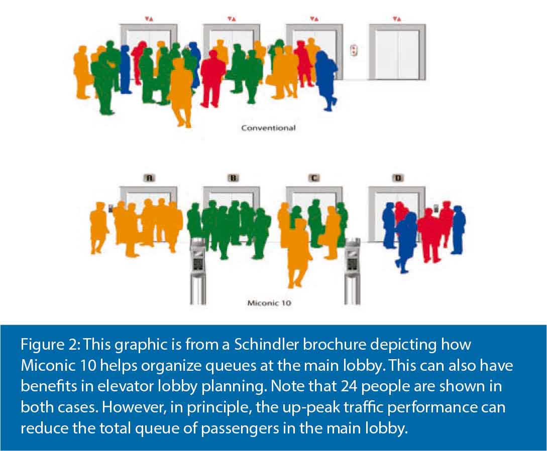 The primary traffic benefit tends to be at the main lobby, to improve handling capacity for incoming traffic. Note that the improvement in up-peak traffic performance at the main lobby can be significant with single-deck and very significant with double- deck elevators, which stop at two floors at a time when leaving the main lobby to handle incoming traffic. However, these improvements should not be used to reduce elevators, as standard destination dispatching can increase waiting times during the lunchtime peak. (An exception is using the dispatching for a group of shuttle elevators serving multiple residential sky lobbies in a supertall building as covered in “Sequel: Is 4,000 fpm (20 mps) Enough?” by your author with contributions from Sean Morris and George Wisner.[3] )