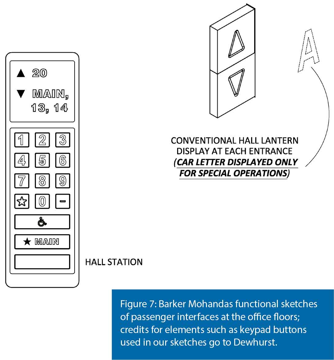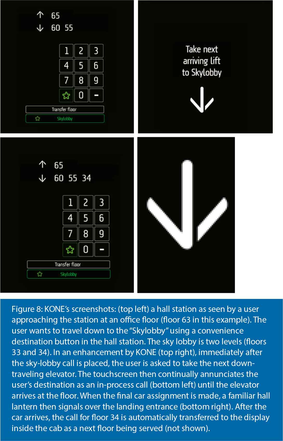 Stops have been simplified compared to those planned. There is also an amenities level served by all eight cars, and fewer than all cars serve a special stop both above and below the typical terminal floors, where we expect comparative improvements will be greater with the improved/harmonized approach to help handle these complications when making car assignments. However, even with the simplified stops, we can see the dispatching comes close to eliminating long waits for these single-deck elevators during lunchtime. The improvements in user interfaces are also provided for the more common single-deck elevators in our industry.