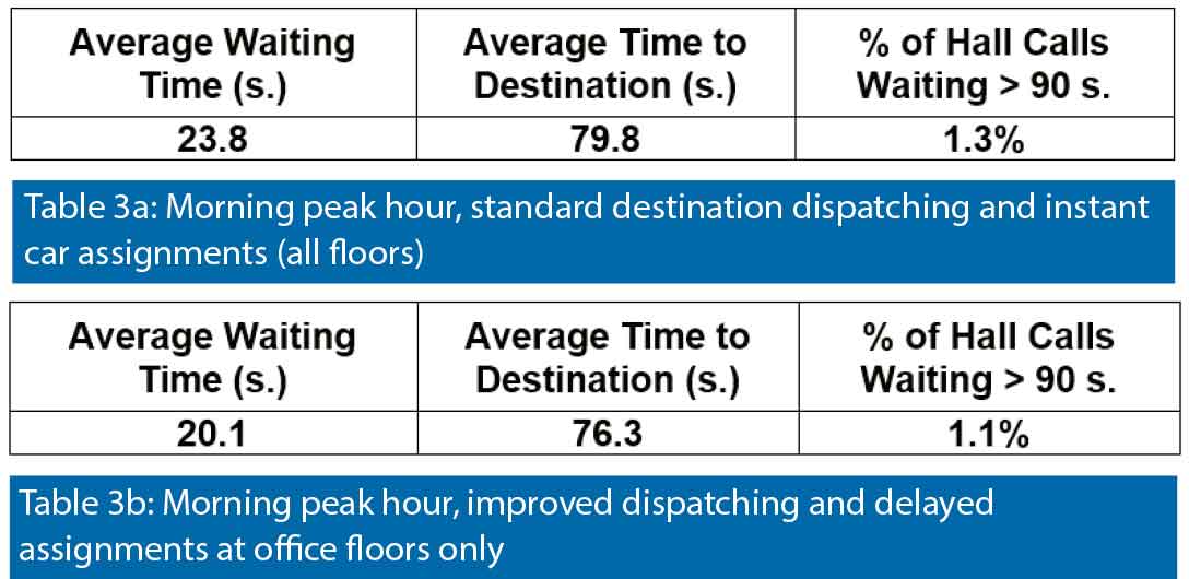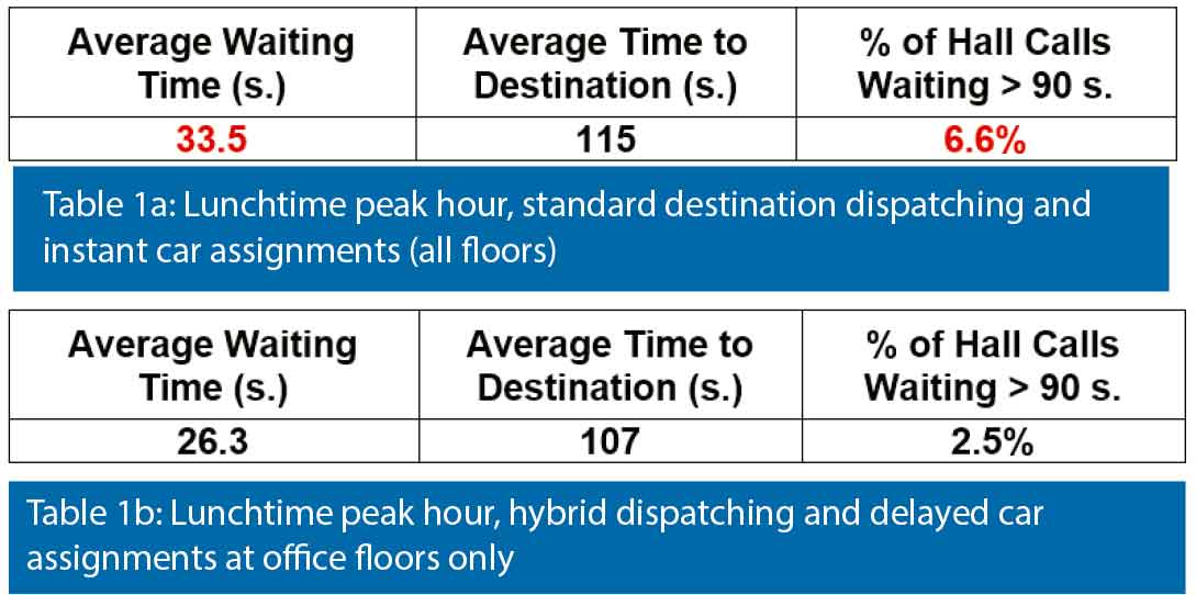 Table 1 compares the results of the initial simulations provided and rechecked by project winner KONE. These are believed to be without extensive R&D in dispatching to take advantage of both knowing destinations in advance and delaying car assignments at the office floors. They reflect results for their hybrid dispatching, obtained using the KONE Building Traffic Simulator (BTS™).
