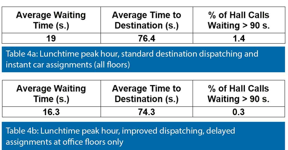 The morning peak performance was never expected to be an issue in retaining destination dispatching at the main lobby, so those results are now shown more to complete the story. Similarly, we also show dispatching simulations for the lunchtime peak hour for a group of eight single-deck elevators.