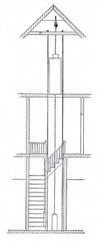 Hall provided two drawings that depicted his dollhouse elevator: a perspective view and a front elevation (Figures 1 and 2). The elevation clearly indicates the narrow car door opening, and the perspective drawing depicts the design’s essential components (and included, for unknown reasons, a detail drawing of a pulley). Both drawings include an odd cylindrical feature on top of the car. This was a small piece of lead pipe that had cosmetic and utilitarian purposes. The pipe concealed the screw eye, to which the hoisting chain was attached, and added weight to the car. The latter feature was important because of the lightweight nature of most cigar boxes. (The vintage cigar box used in the reconstruction of the Stout elevator car weighs only 5.5 oz.) Thus, the added weight helped hold the hoisting chain firmly in the sheave grooves. The lead-pipe counterweight was to “be just heavy enough to make a perfect balance between it and the car.” The elevator was also carefully depicted on the dollhouse plans; it was in the stairwell, a normative residential placement (Figure 3).