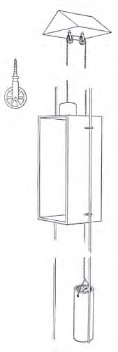The materials list for his dollhouse elevator included “two small pulleys, 4 ft of brass chain, 6 ft of No. 12 wire, half a dozen double-pointed tacks or screw eyes, a short piece of lead pipe and a cigar box.” The brass chain, doubtless chosen for its decorative character, as it would have been visible, served as the hoisting rope and connected the car to the counterweight. The chain ran through two pulleys or sheaves located at the top of the shaft. The wire formed the “guide rails” and ran through pairs of double-pointed tacks or screw eyes placed on the sides of the car. Hall gave the cigar box a vertical orientation, with the opening