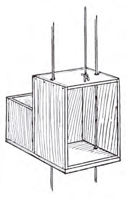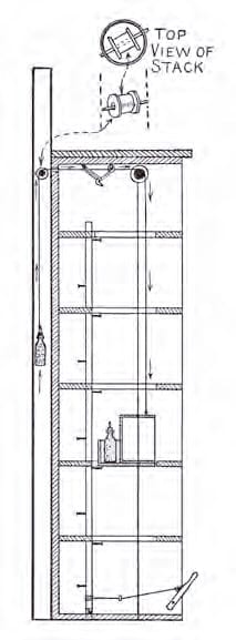 Hall also designed a simple control mechanism. This consisted of a stick or dowel, which could be made from a “broom handle, curtain pole or flagstaff.” The dowel was placed at the rear of the shaft, extended from the bottom to topmost floorplate and installed such that it could rotate. Nails were driven into the dowel on alternating sides at heights matching the floor levels. A control string was wrapped around the base of the dowel, with the string ends attached to control levers (Figures 5-7). Pulling down on a lever caused the shaft to rotate, placing a nail in the car’s path and stopping its movement.