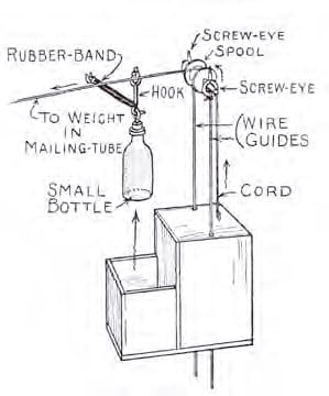 “With the hook and rubber band properly adjusted, this is what happens when the car ascends to the top of the shaft. The bottom of the rear portion of the car strikes the bottle, lifts it enough to release the end of the hook, and the rubber band springs the hook out of the way. The bottle remains upon the rear portion of the car, and its weight carries the car to the bottom of the shaft.”