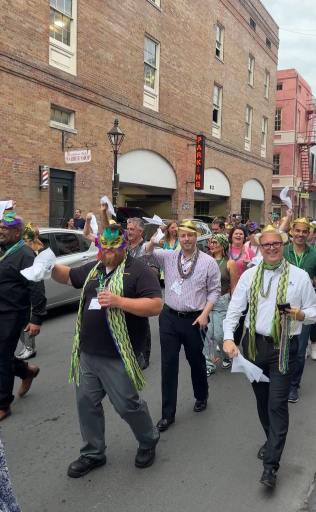 A second-line parade through the French Quarter streets followed by a lavish rooftop reception in the Monteleone’s Riverview Room proved a fitting end to a day of learning. Starting at 5:30 p.m., guests met in the Royale Parade Departure Room to don masks, hats, beads and scarves as they enjoyed Hurricane cocktails prior to joining in the second line behind a loud and lively brass band. “I wasn’t sure what to expect but it was such a great night,” Molly Cruz, Schindler national sales and process manager, said. “NOLA didn’t disappoint!”
