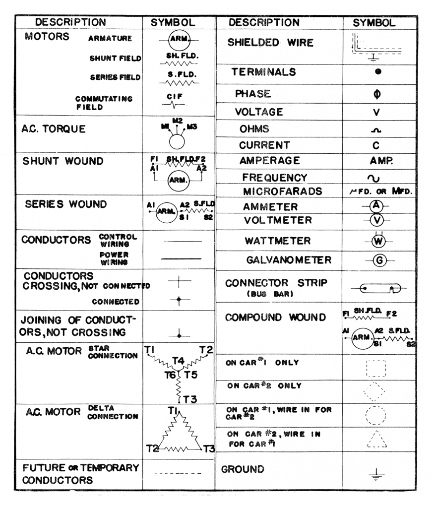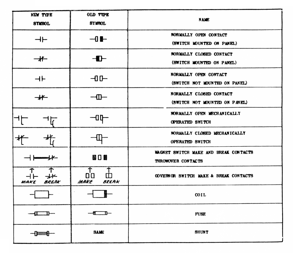 “The electrical symbols used in our drawings are somewhat similar to those in general use throughout the industry. However, there are many that are peculiar to Otis which do not follow the standard pattern. The Otis symbols have had numerous revisions in the past due to changes in the application of the symbol and also to the change in the design of the part represented. These tables show some of the old and new type symbols, with the functional name of each.”[4]