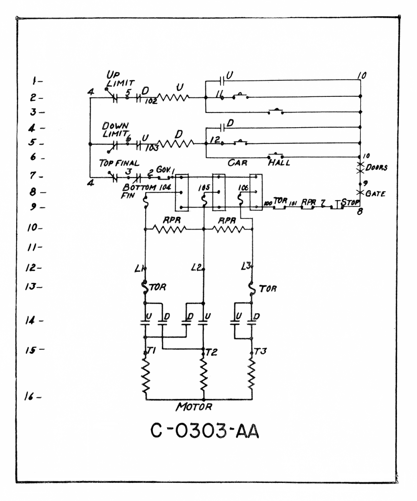 “This one will be on the car not leaving the floor. As you know, we could go on indefinitely shooting trouble on a complex system. Our purpose will be served, however, when our students can recognize the possible sources of trouble and analyze the definite source from observation, tests and elimination by using a meter. When they can do this, they can, if given time and a print, fix any elevator of any make or control system. Study and practice will shorten the time required. Study and practice will make the tests quicker, easier and more positive. In other words, teaching the ways to do this is the whole purpose of the course. Here we are with a car that will not run. Here is where it does not pay to ‘just poke’ at the switches.”[25]