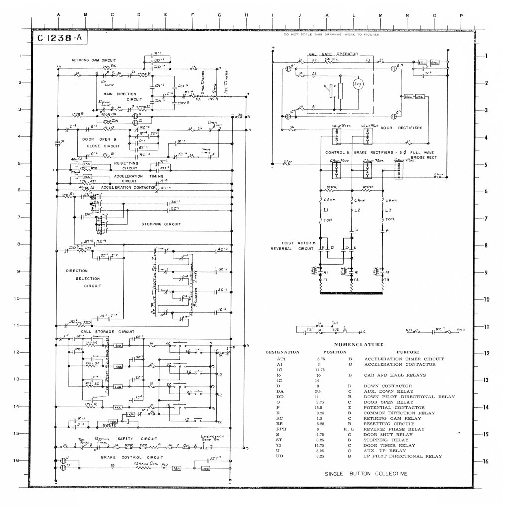 The next wiring diagram, Print No. C-1238-A, was published in two parts, with students expected to remove the pages from the magazine and “assemble” the complete drawing (Figure 4). According to Tamsitt: “This print was selected because it is a single button collective, which will start us into the “stored call” method of control, and also because it has a retiring cam with a car door operator. It (also) has a single speed AC Motor with one step of acceleration.”[9] The lessons focused on 1.) picking up relay calls and determining the car’s detection of travel; 2.) closing the car door, lifting the retiring cam, releasing the brake and running the car; 3.) stopping the car, opening the door, canceling the call, closing the door and starting the car; and 4.) canceling the calls as they were answered.[10,11,12]