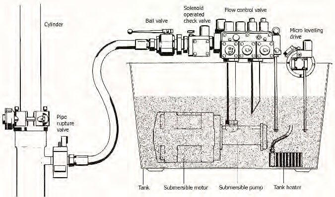 The hydraulic power unit is made up of a tank, oil, motor, pump, control valve and related accessories connected to the hydraulic cylinder with a hose pipe or a metal pipe. This driving unit is usually located in the machine room or, in some machine-room-less (MRL) units, in the elevator shaft itself.