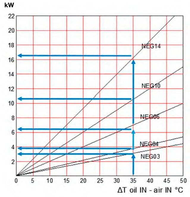In a true balance, what goes in must be accounted for, either as a temperature increase or transfer of heat out of the system. Thus, if generated heat is higher than that dissipated, a heat exchanger with a cooling capacity of that difference is selected. When designing a new hydraulic elevator system, a good rule of thumb is that a cooler should be sized to remove approximately 25-30% of the input power. Cooler manufacturers have selection charts that make the selection of coolers relatively easy. The size of the cooler is based on the amount of heat (in kilowatts) that needs to be neutralized with respect to a temperature difference (△T) in accordance with ambient temperature. Figure 7 shows a typical selection chart of oil cooler sizes from a cooler manufacturer.