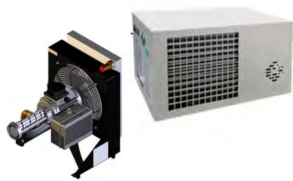 Refrigerated oil coolers are uncommon but can also be found in installations where the ambient temperature is very high and the elevator is used frequently, such as in shopping malls, hospitals, exhibition centers, etc. A refrigerated oil cooler works very much on the same principle as a refrigerator. The warm oil from the tank, which is circulated by means of a pump, exchanges its heat with the coolant, being circulated in the refrigerator by a compressor. Thus, the oil is quickly cooled and delivered back to the hydraulic tank.