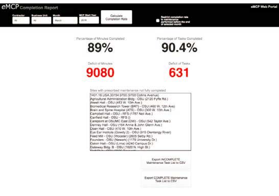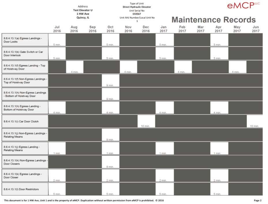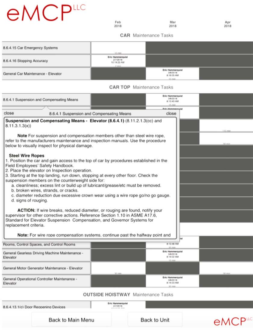 To ensure all maintenance tasks are recorded, any maintenance system must provide the technician access to all the required tasks and procedures, and a method of recording all tasks and their completion. Access to the completion data must be available to owners and maintenance companies for maintenance management. eMCP provides all the code-required records and procedures, can be used to survey the equipment and establishes the intervals according to the code criteria.