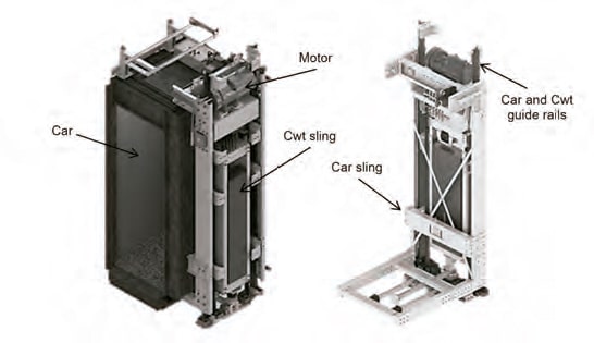 The MRM W Line, based on an L-Frame car sling with a counterweight integrated on the rail guides, roping 1:1 or 2:1, 1-0º/90º/180º access, 2,600-mm headroom, 350-mm pit room and with a motor with reduced dimensions designed to achieve the maximum performances in the minimum well space (Figure 1).