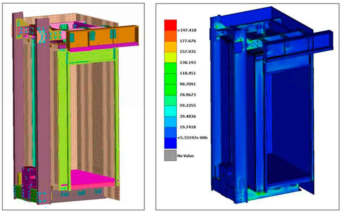 An FE model of a full elevator system using a frameless full-glass car is built after the validation of the FE model of the previous experimental setup. The complete model is solved numerically in transient response analysis to calculate the maximum stresses developed (Figure 10).
