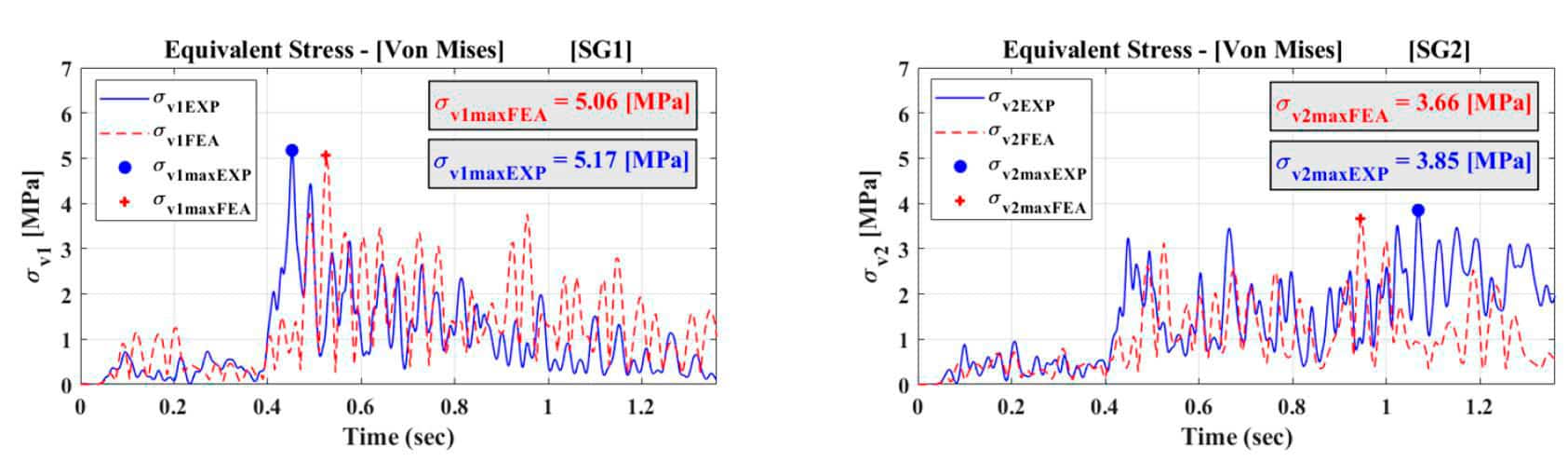 - Figure 12: Comparison of experimentally measured (continuous lines) and numerically determined (broken lines) equivalent (von Mises) stress histories with the maximum value of this stress at the locations SG1-SG2 during one of the tests