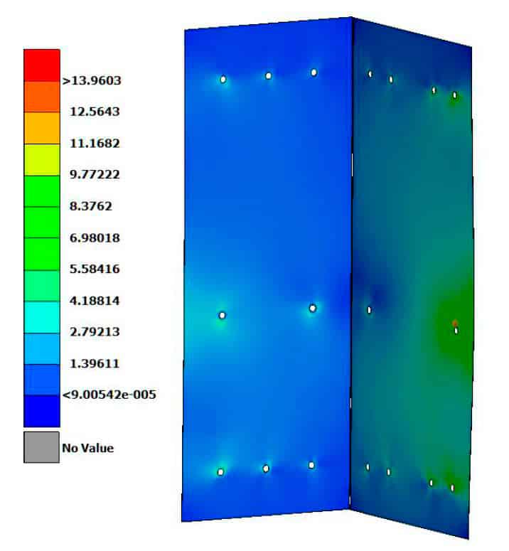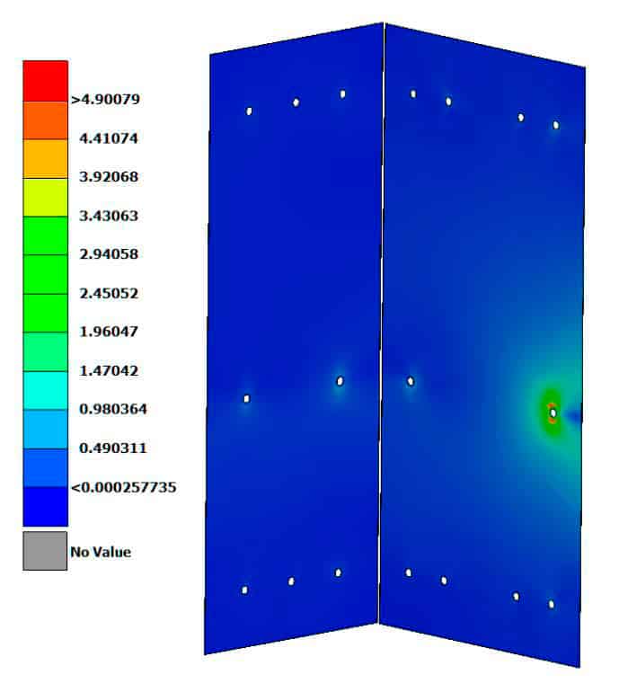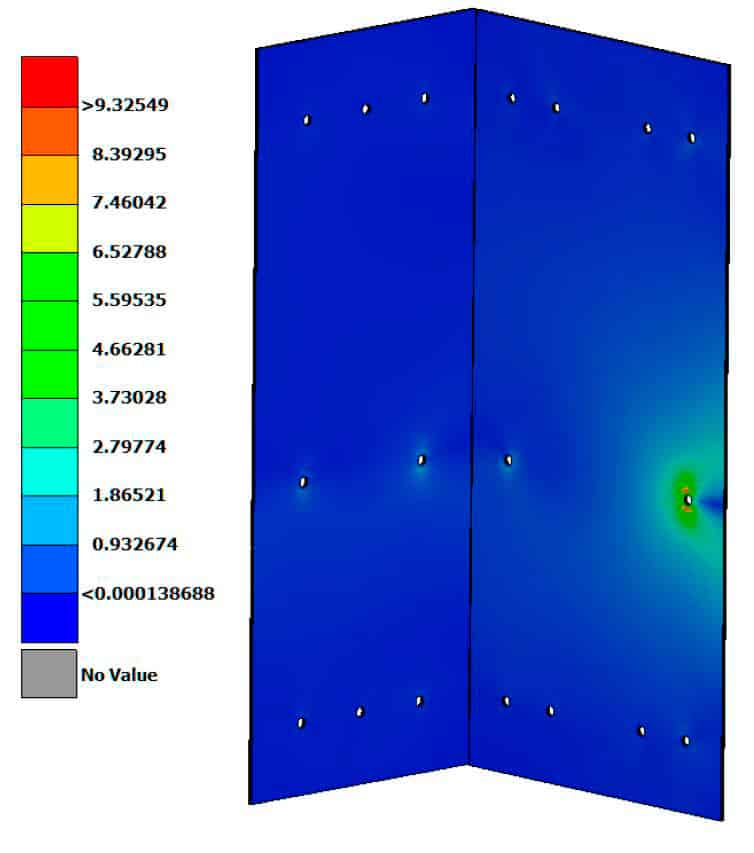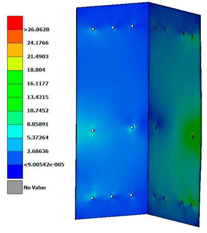 The FE model is solved numerically to calculate the maximum stresses developed in the glass surface for the given loading. In case 1, a maximum stress of 26.9 MPa is calculated (Figure 14). This value is much lower than the characteristic bending strength of either thermally toughened glass (120 MPa) or heat- strengthened glass (70 MPa.)[5] In case 2, a maximum stress of 9.3 MPa is calculated (Figure 15). This value is much lower than the nominal tensile stresses of 35-55 MPa[1] for 6-mm plate thickness.