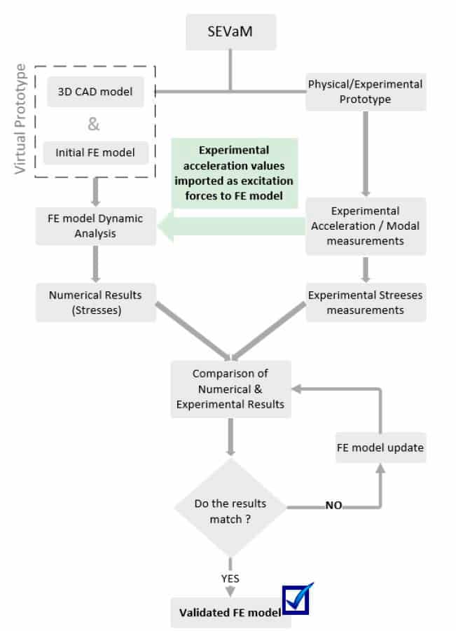 In SEVaM, the main experimental assembly is first divided into its major functional subsystems. An initial FE model based on the corresponding 3D computer-aided design (CAD) model is constructed for each subsystem. Then, the corresponding experimental structure for each subsystem is built. The procedure presented in Figure 4 is applied to validate the accuracy of the initial experimental product. For each subsystem, acceleration values are measured experimentally and passed as excitation forces to the FE model, and a dynamic analysis is performed.