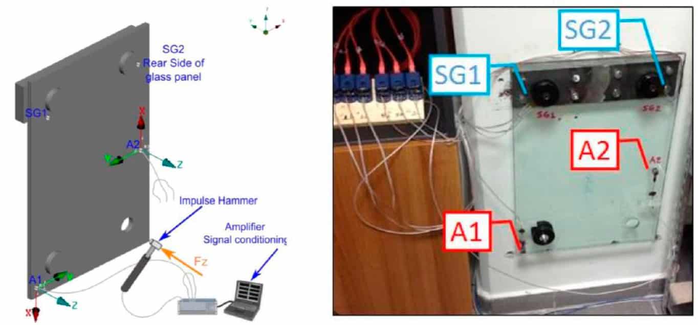 The geometry of the glass panel with the suspension component is discretized mainly by solid tetrahedral elements. Some appropriate software is used for the development and solution of the FE model.[20 & 21] The detailed FE model of the experimental device is presented in Figure 5. Two typical eigenmodes, predicted by the nominal FE model, are presented in Figure 6. After the development of the nominal FE model, an experimental modal analysis of the experimental setup was performed to quantify its dynamic characteristics. The system was tested in a fixed-free boundary condition. First, all the necessary elements of the frequency response function (FRF) matrix required for determining the response of the frame substructure were determined by imposing impulsive loading.[12, 19 & 22-24] The measured frequency range was 0-2,048 Hz, which includes the analytical frequency range of interest, 0-400 Hz. An initial investigation indicated the frame has six natural frequencies within this range. A schematic illustration of the experimental setup is presented in Figure 7. In this image, the locations of two triaxial accelerometers (A1, A2) and two strain gauges (SG1, SG2) are presented.