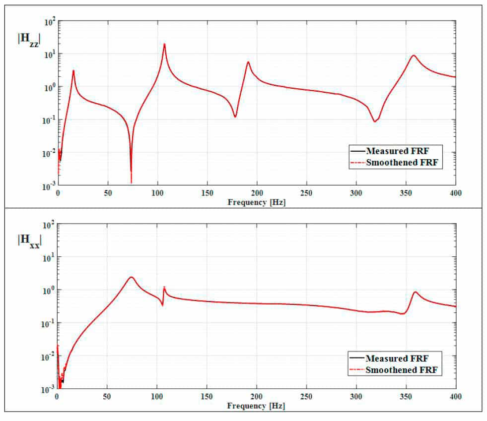 Figure 8 shows the magnitude of two typical elements of the FRF matrix before (continuous line) and after (dashed line) application of the Welsh’s smoothing method, which were recorded by the above experimental setup.